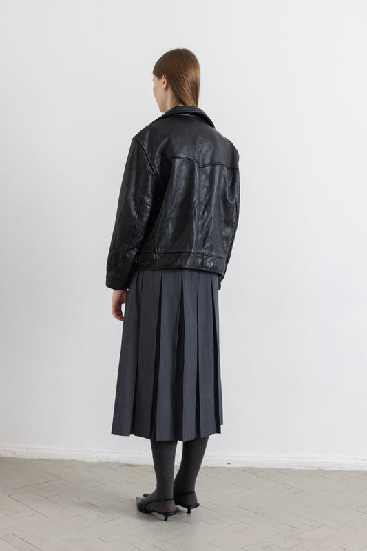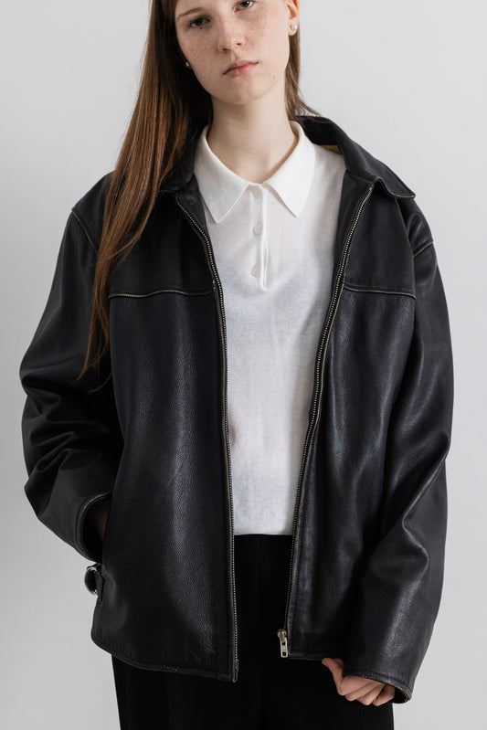 Vintage Black Boxy Leather Jacket With Faded Seams