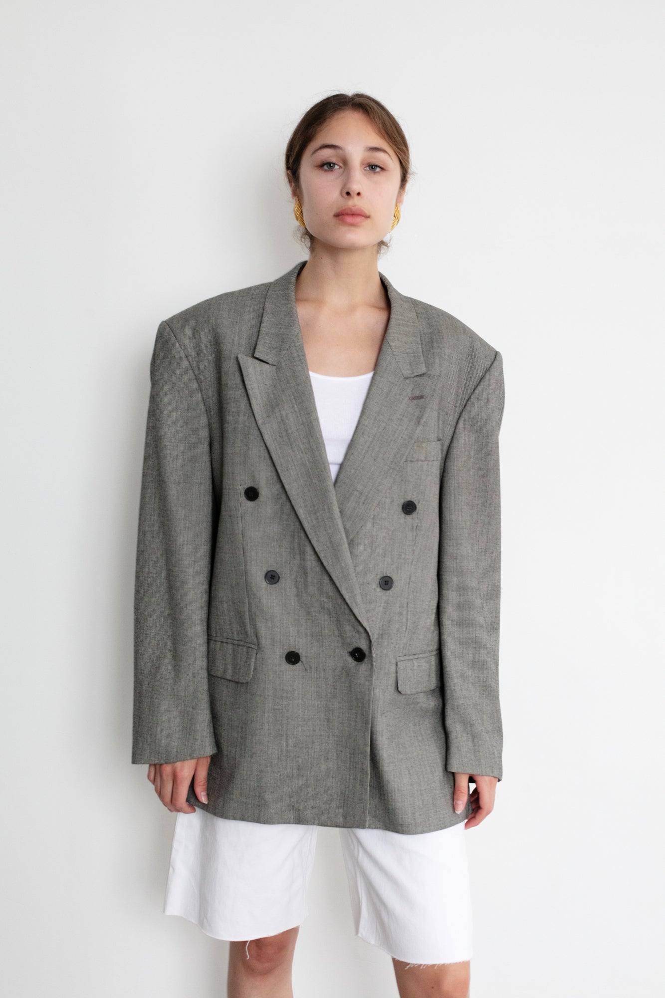 Vintage grey double-breasted blazer detailed with one chest pocket and two flap pockets on the front. Featuring an oversized fit, this blazer is made of pure new wool and polyester blend. Label: Linea Massima. Fabric contents: 55% polyester, 45% pure new wool; lining 100% viscose. In great vintage condition.