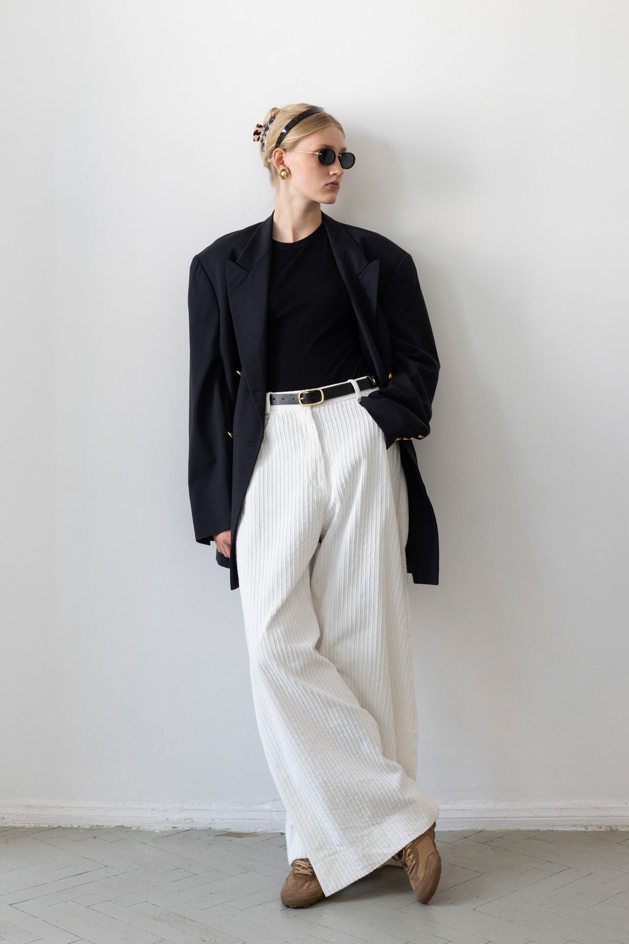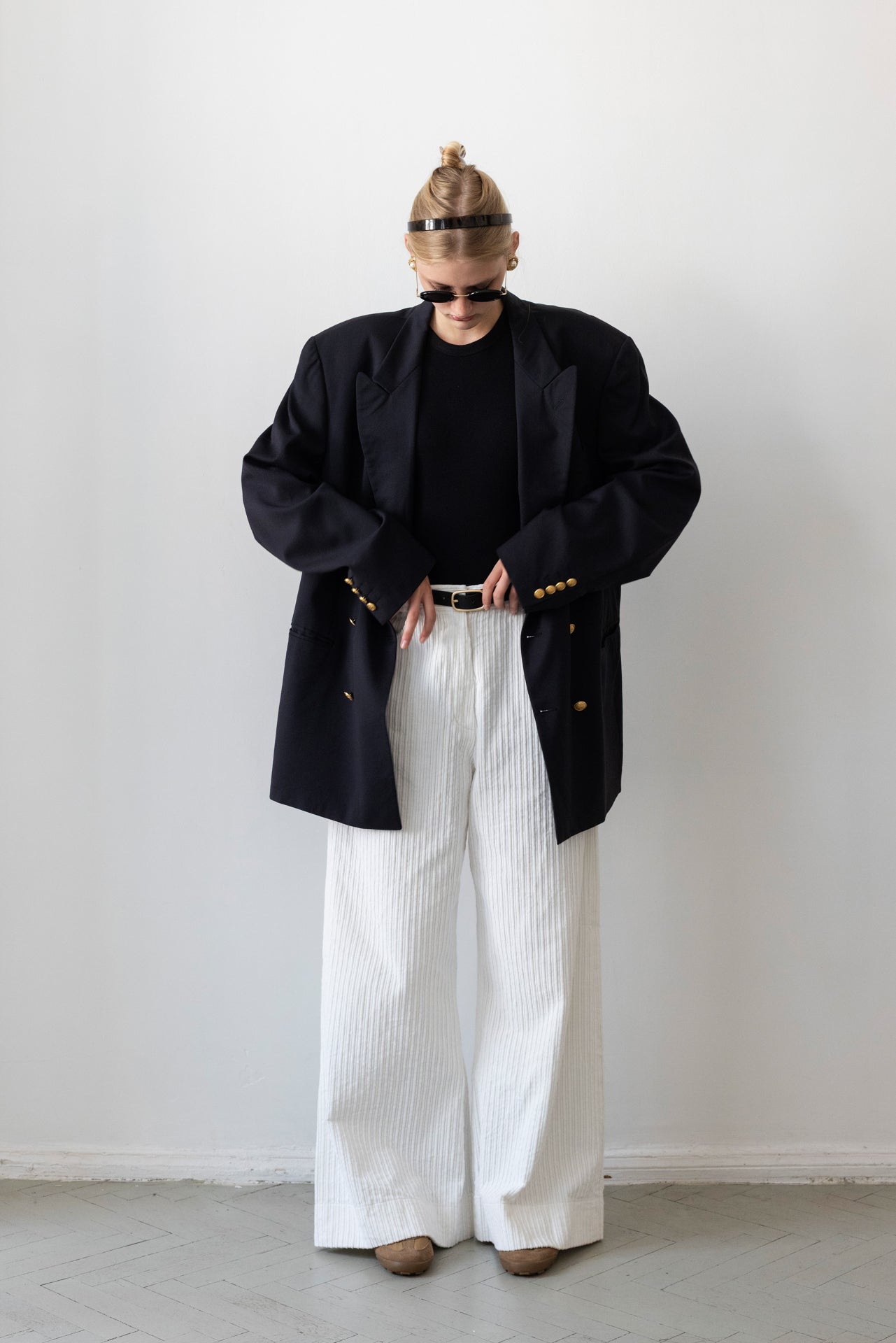 A timeless vintage blazer in classic navy, designed with a double-breasted front and a relaxed, oversized fit. Effortlessly chic, it’s a go-to piece that brings subtle sophistication to any outfit. Label: Guy Laroche Paris. Made in France. Fabric contents: 100% pure new wool Super 100's. Well-preserved vintage piece with small fabric cuts on the right back side. Please note: minor wear may be present due to it's vintage nature.
